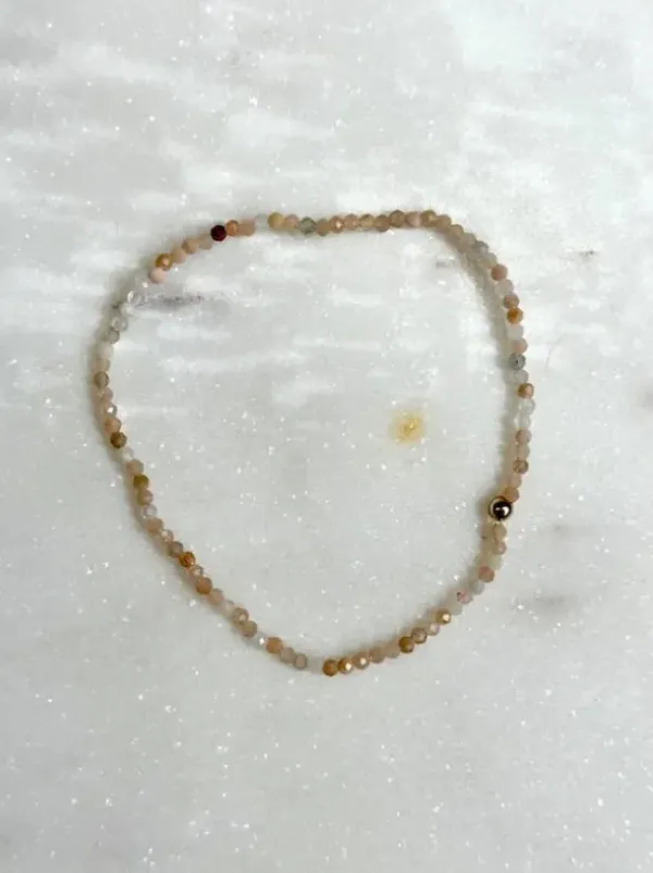 Lasihelmet ja pienet kivet pujotettu elastiseen silikonilankaan, joten korun käyttö helppoa ja se sopii moneen käteen. Pieniä pituuseroja esiintyy, joten kerro lisätietokentässä, haluatko mielummin hieman suuremman vai pienemmän korun.