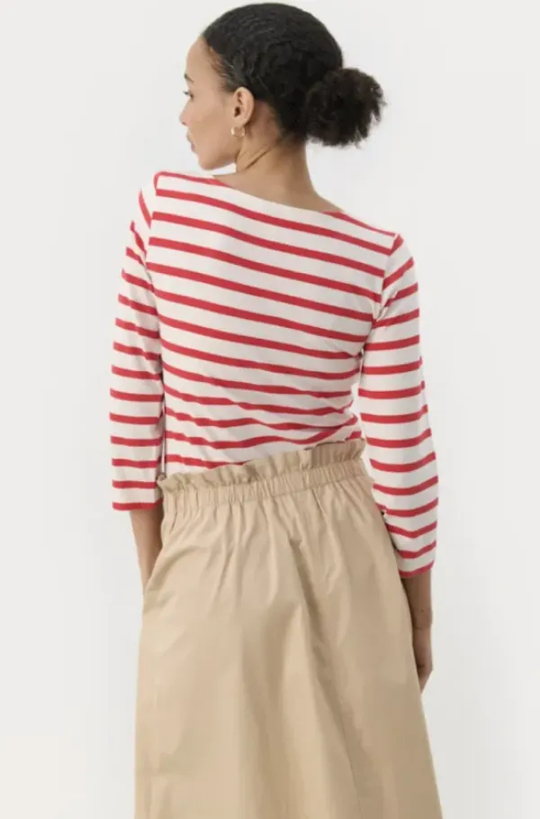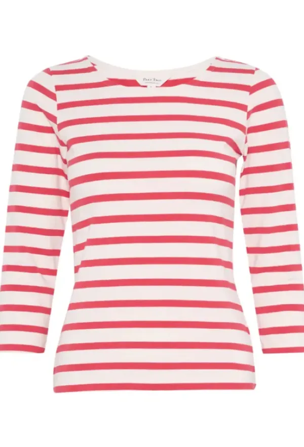 Part Twon raikas raidallinen trikoopaita 3/4-pituisilla hihoilla. Klassinen slim fit malli, joka on helppo pukea esim. neuleen alle. Kesällä ihana sellaisenaan shortsien tai pellavahousujen kanssa.
