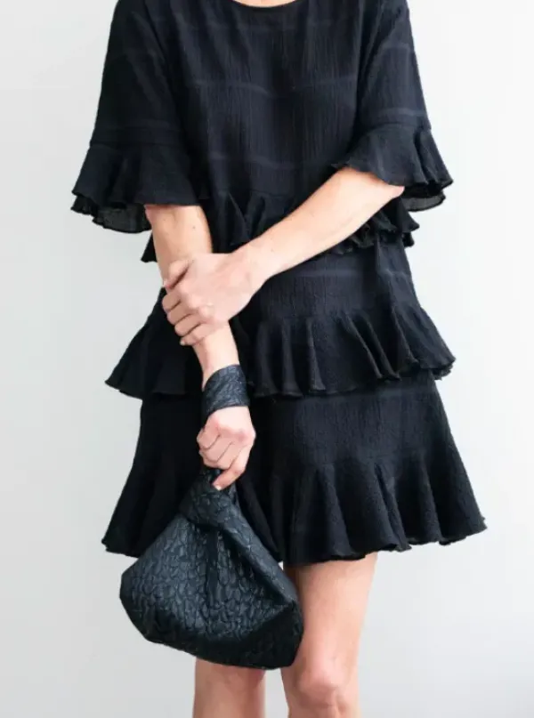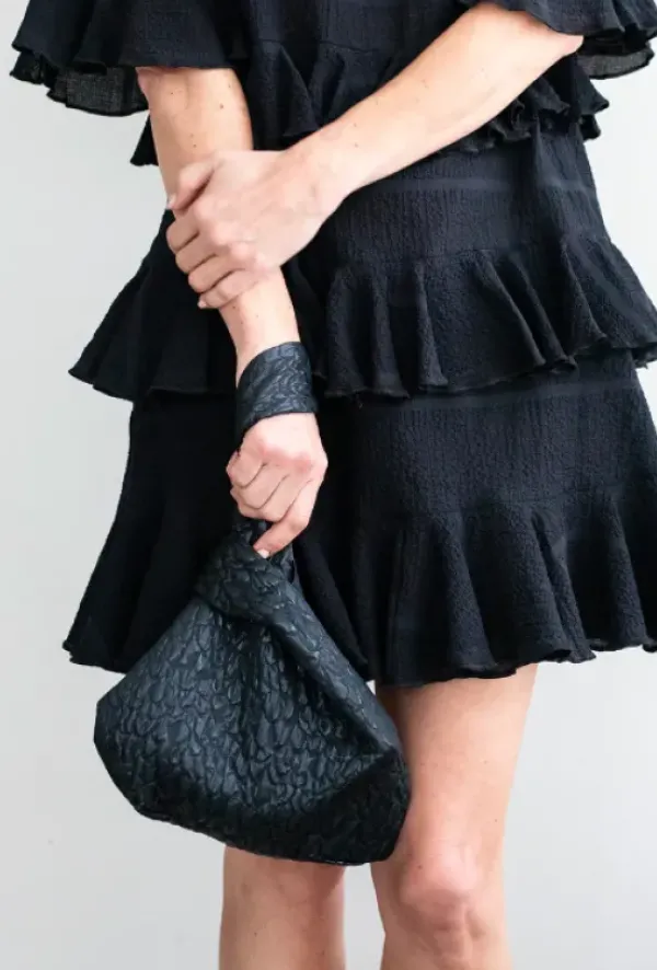 Näppärän kokoinen pieni pussukkamainen käsilaukku iltamenoihin. Tähän pussukkaan mahtuvat huulipuna, avaimet ja kännykkä. Kiva kevyesti kiiltävä kangas. Pussukassa musta vuorikangas.