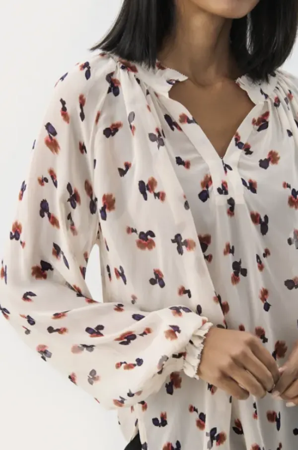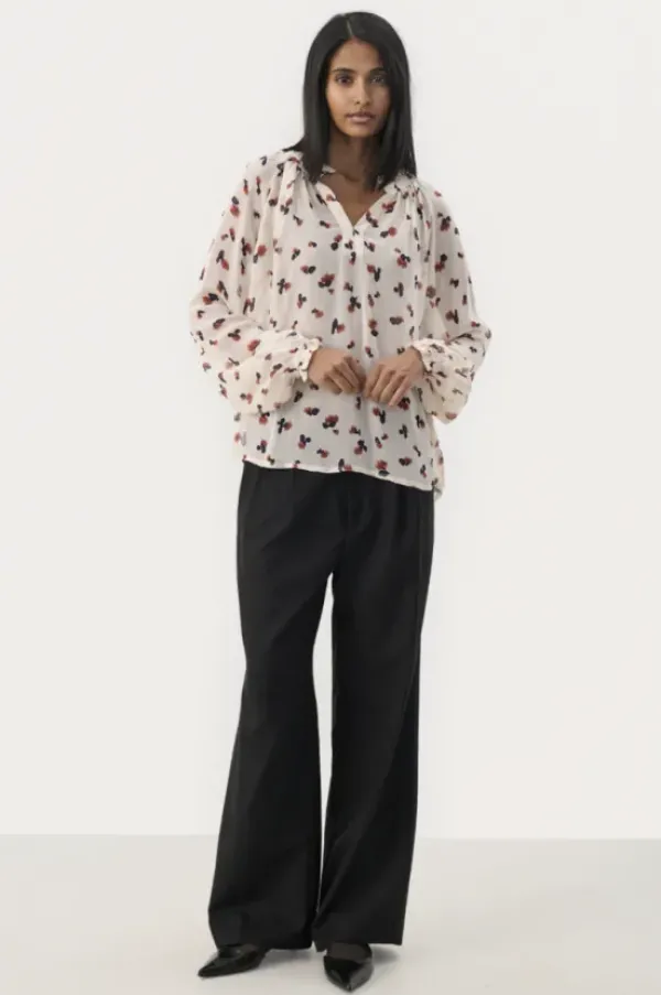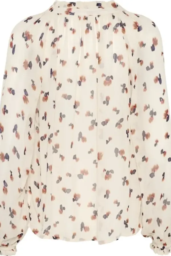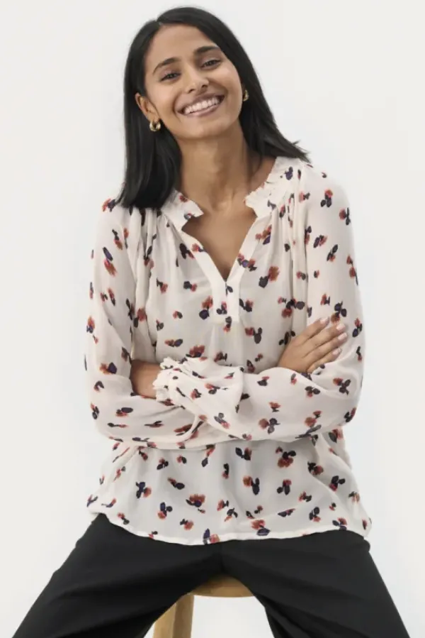Part Twon kiva kuviollinen paita, jossa pitkät hihat kuminauhoilla. Kiva pieni pystykaulus ja edessä v-kaula-aukko. Kaunis kuviointi vaalealla pohjalla. Materiaalina laskeutuva viskoosi.