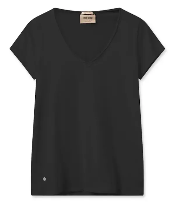 Mos Moshin uusi perus t-paita v-kaula-aukolla, Luomupuuvillasta valmistettu hengittävä ja pehmeä teeppari sopii hameiden ja farkkujen kanssa ja se on ihana perusneuleen alla. Ilmettä tuomassa päärmäämätön kaula-aukko pienellä rosolla. Helmassa pieni Mos Mosh -logonappi ja niskassa pieni logoprintti.