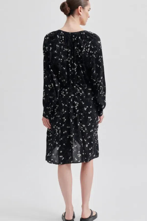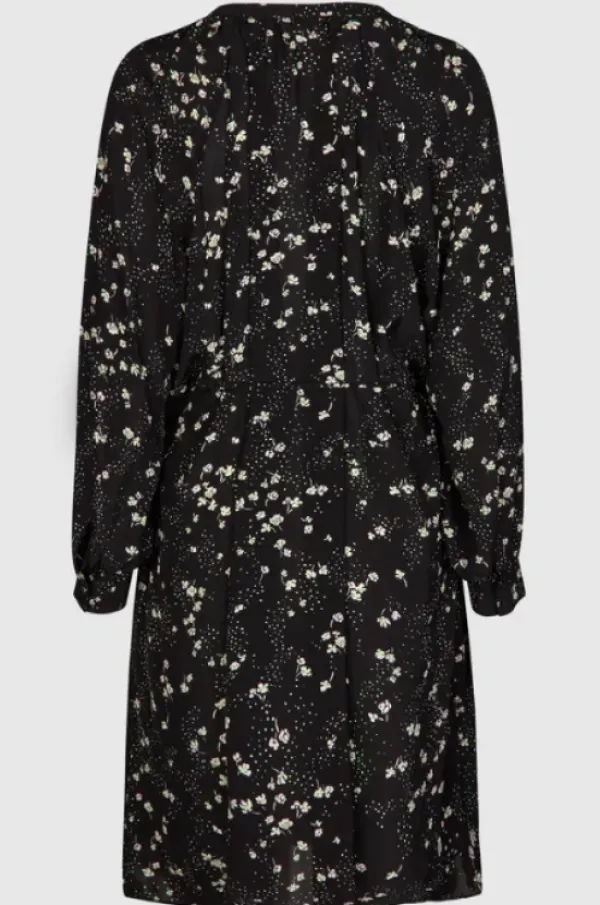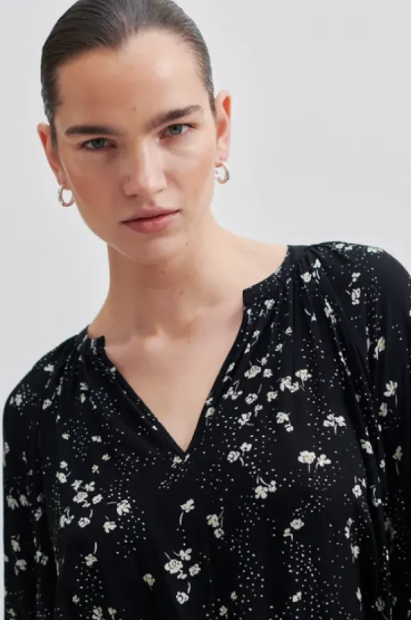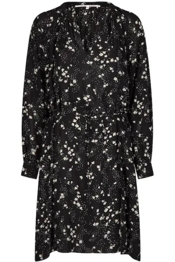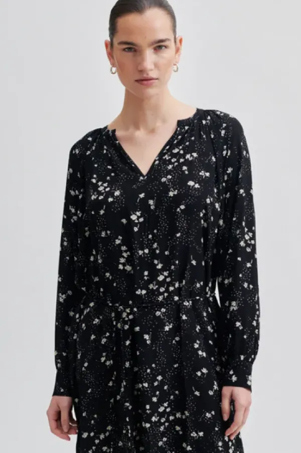 Second Femalen rento tunikamekko kukkakuosilla. Materiaalina pehmeä ja sileä viskoosi. Väljä malli suoralla silhuetilla. Voit käyttää sellaisenaan tai koristaa vyötäröä vyöllä. Matala mandariinikaulus ja nappikiinnitys hihansuissa.