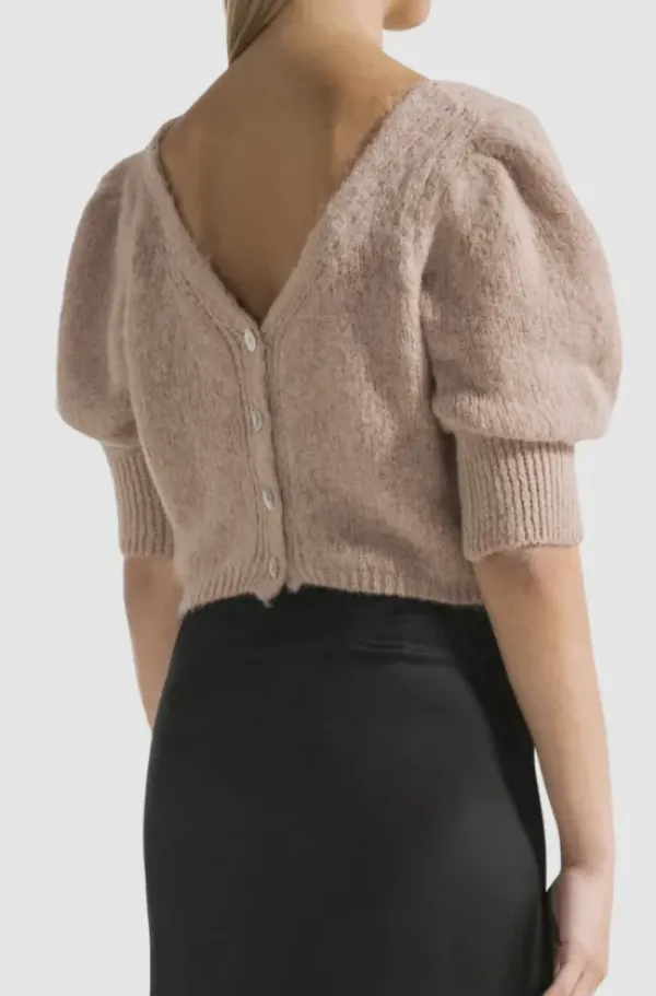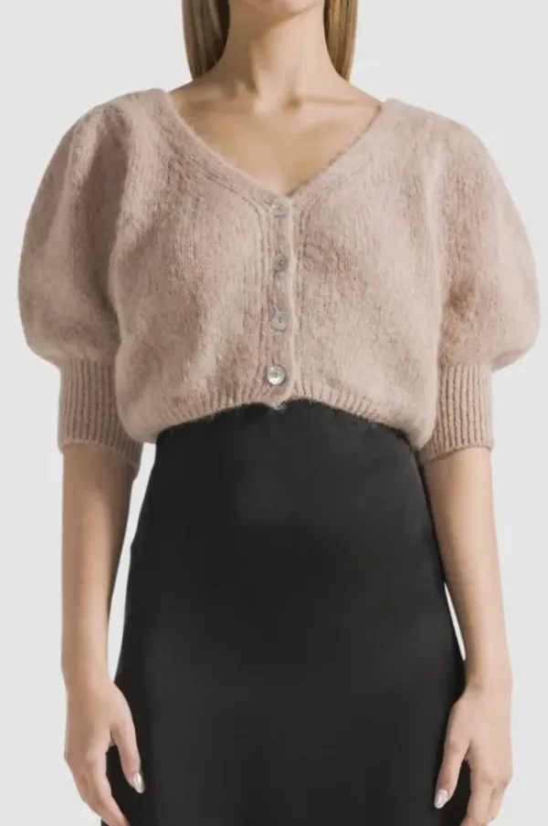 Americandreamsin kaunis lyhyt neuletakki lyhyillä puhvihihoilla. Pehmoinen alpakka tuntuu kivalta iholla. Voit pukea neuletakin myös puseroksi napit selkäpuolelle.
