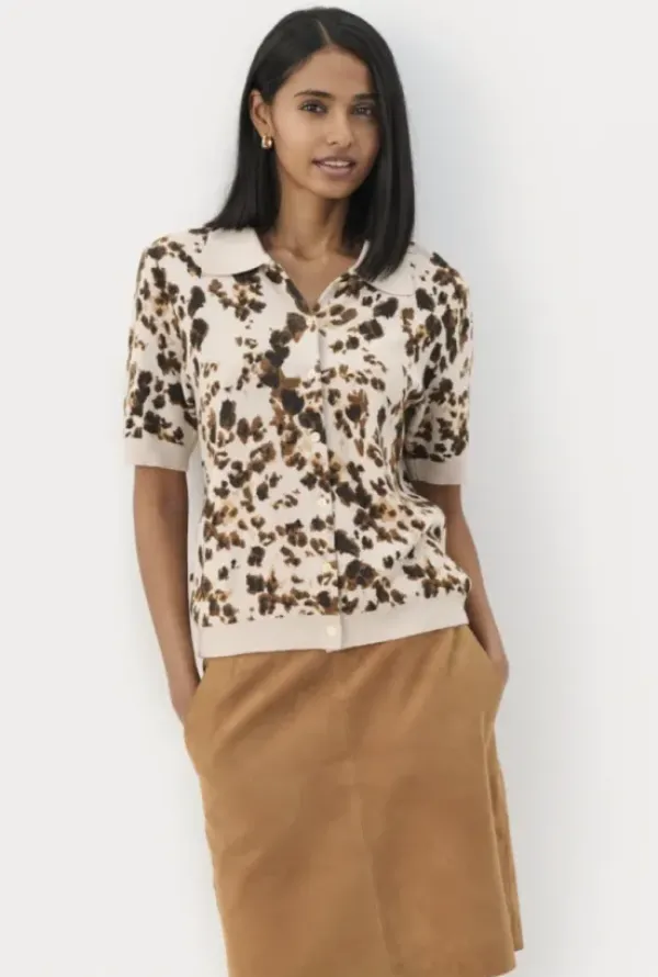 Part Twon kevään uutta: lyhythihainen neuletakki/pusero, jossa kiva leo-kuosi. Pienet paitiskaulukset.