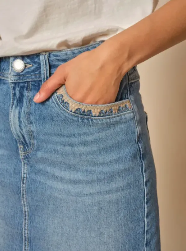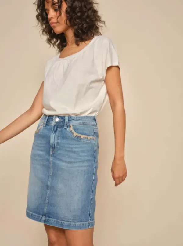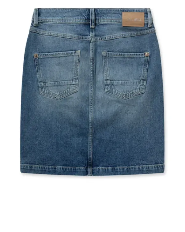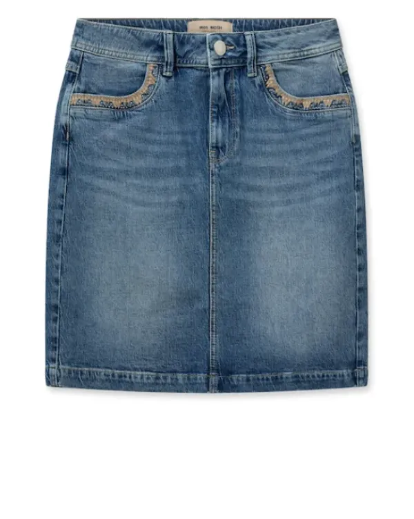 Mos Moshin kevään uutta: klassinen lyhyt farkkuhame kivoilla yksityiskohdilla! Etutaskuissa Mos Moshin ihanat koristebrodeeraukset! Kankaassa ripaus stretchiä.