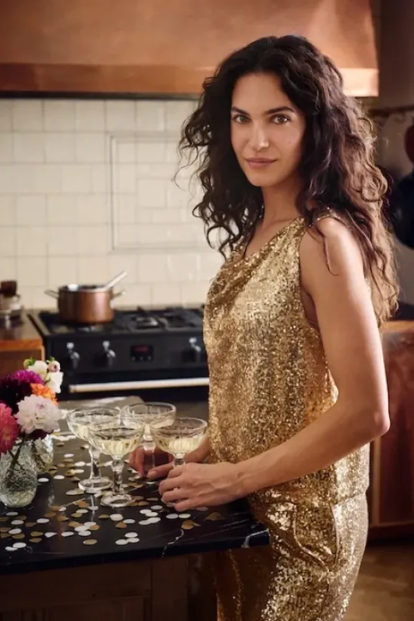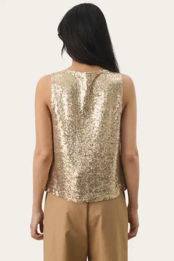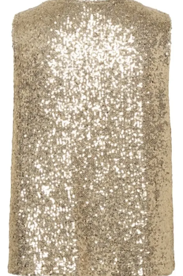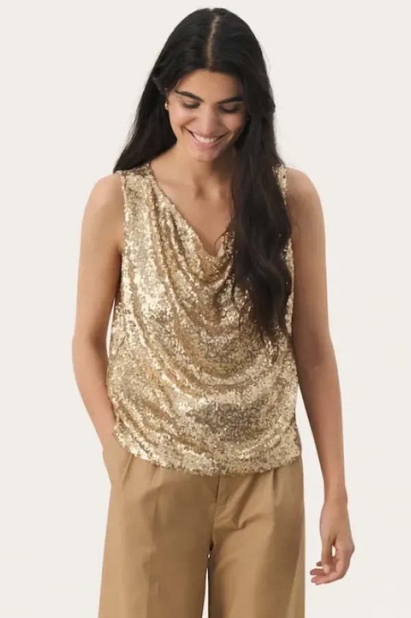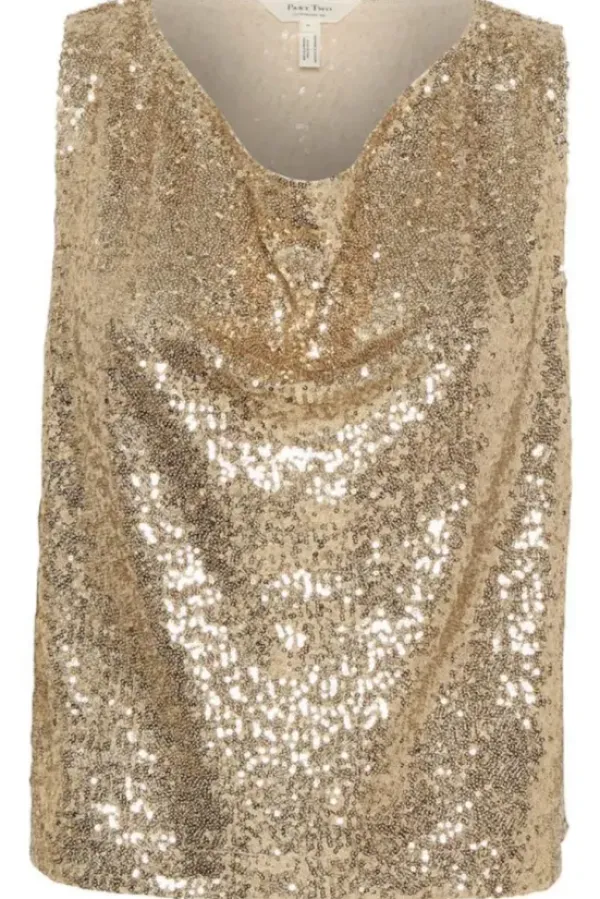 Part Twon näyttävä kimalletoppi kullan sävyisillä paljeteilla! Paljettitoppi on todella helppo yhdistää monenlaiseen tyyliin! Rento, laskeutuva malli, jossa ilmava kaulus.