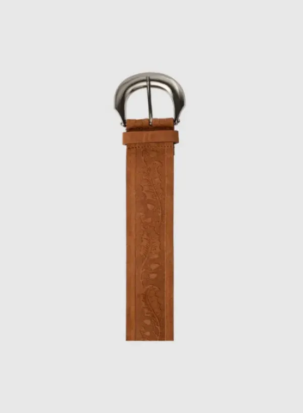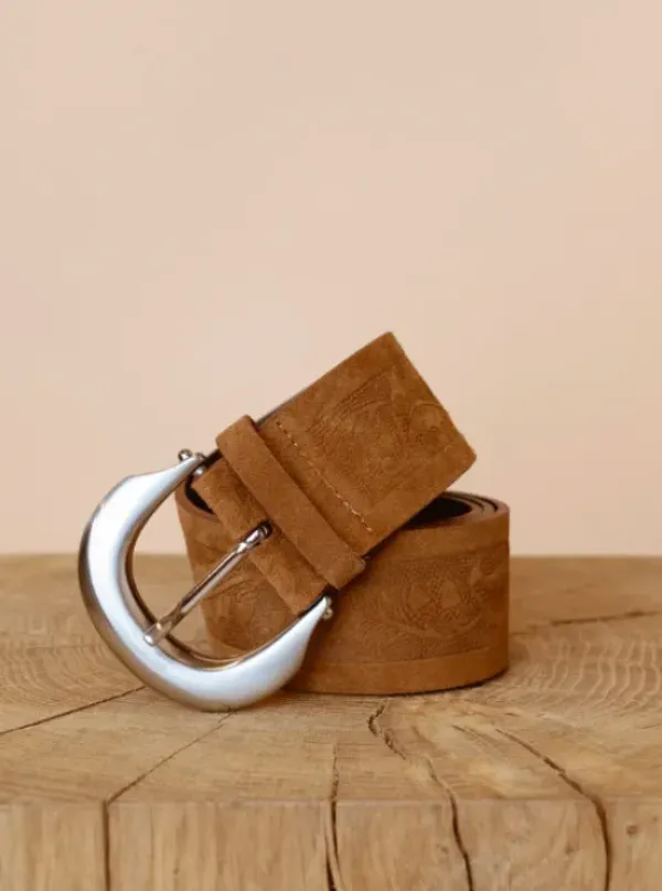 Kaunis vaaleanruskea vyö mokkanahkaa. Vyön pinnalle painettu kiva lehtikuviointi. Ihana vyö farkkujen kanssa. Kokeile myös mekkojen kanssa korostamaan vyötäröä.