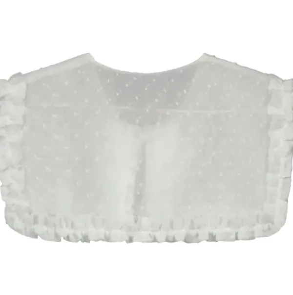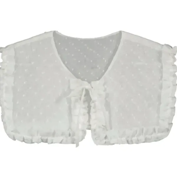 Kotimaisen Gauhar Helsingin neliönmuotoinen kaulus, jossa röyhelöyksityiskohdat, leikkisät pilkut ja rusettikiinnitys.