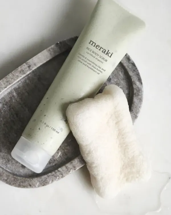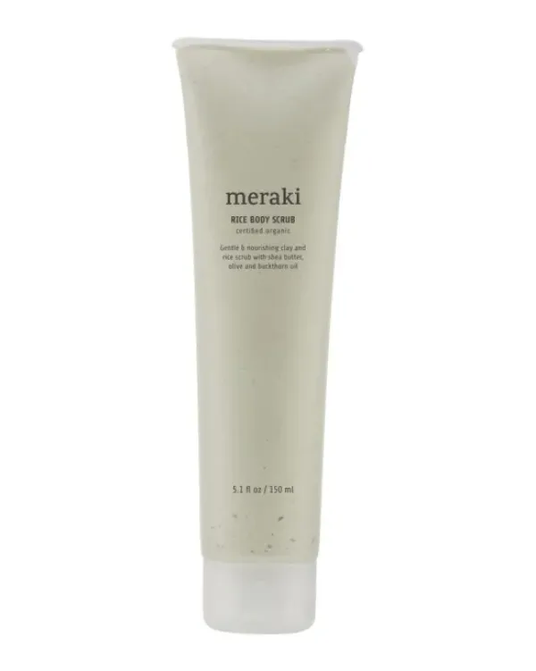 Tanskalaisen Merakin hellivällä kuorintavoiteella saat ihosi lempeästi samettisen pehmeäksi. Sheavoita, aloe veraa, oliivia ja tyrniöljyä sisältävä kuorinta-aine hoitaa ja samalla kuorii ihoa hellästi. Sheavoissa on runsaasti E-vitamiinia, ja eri öljyt kosteuttavat ja pehmentävät ihoa. Käy kehoa läpi pyörivin liikkein ja huuhtele ylimääräiset pois lämpimällä vedellä.