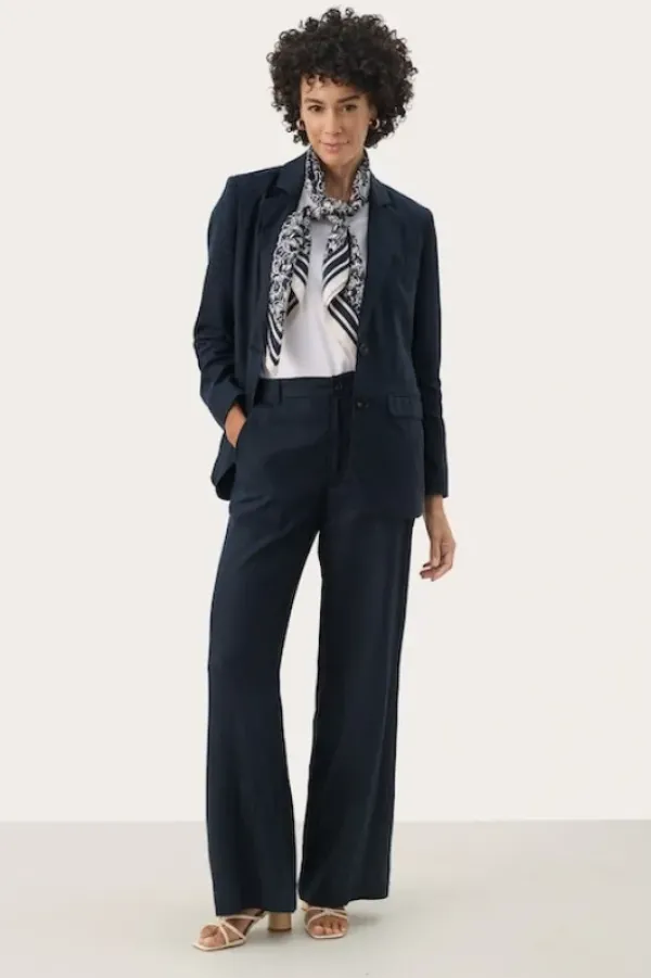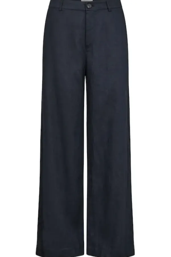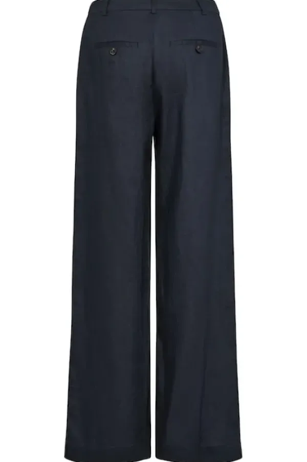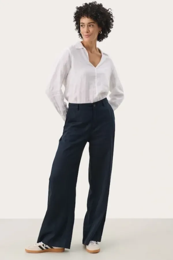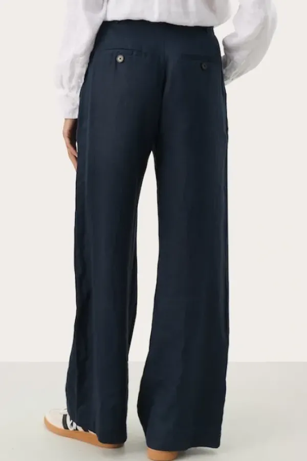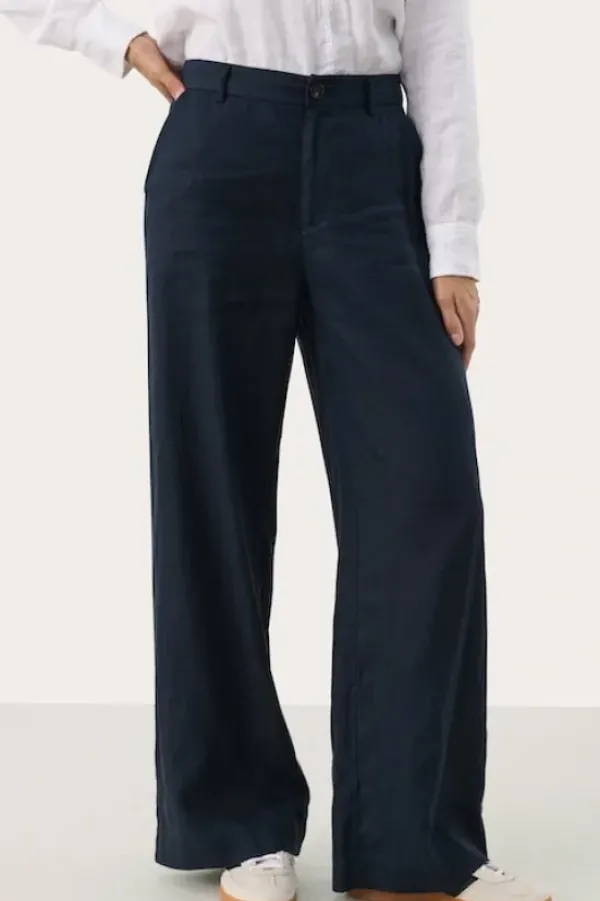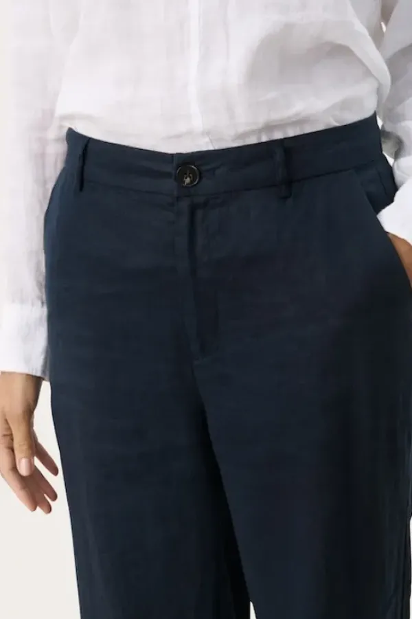 Part Twon kevään uutta: kauniit leveälahkeiset pellavahousut, joissa vyötäröllä vetoketju ja vyölenkit. Napilliset takataskut. Sävynä tummansininen.
