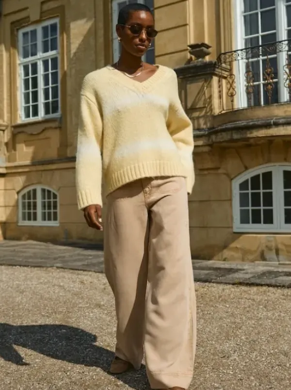 Mos Moshin pehmoinen neule v-kaula-aukolla. Keväinen uusi sävy! Vaatekaapin perusneule, joka on helppo yhdistää monenlaiseen asukokonaisuuteen.