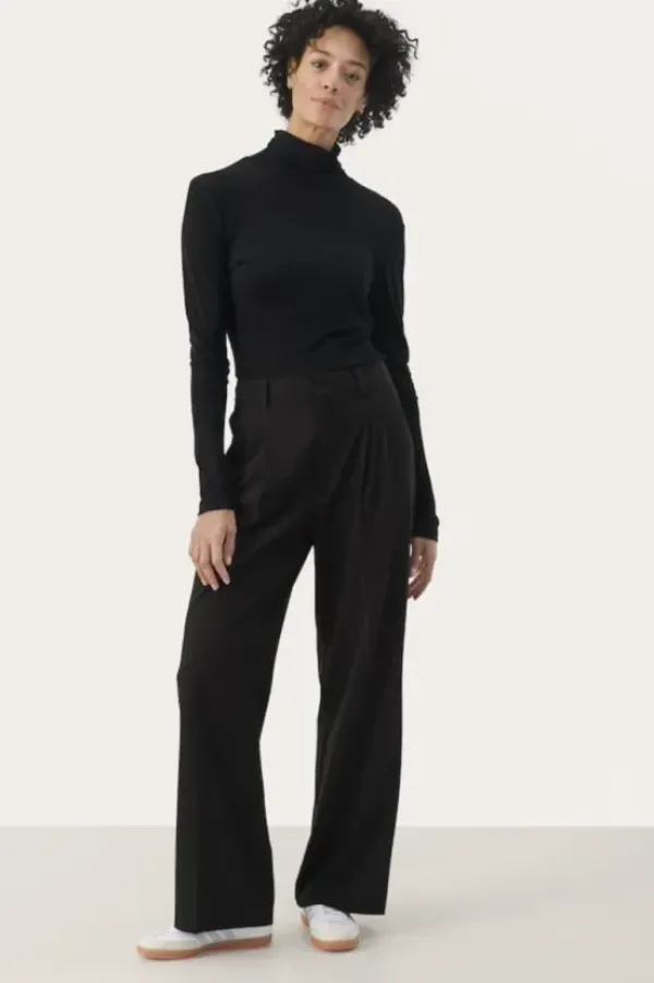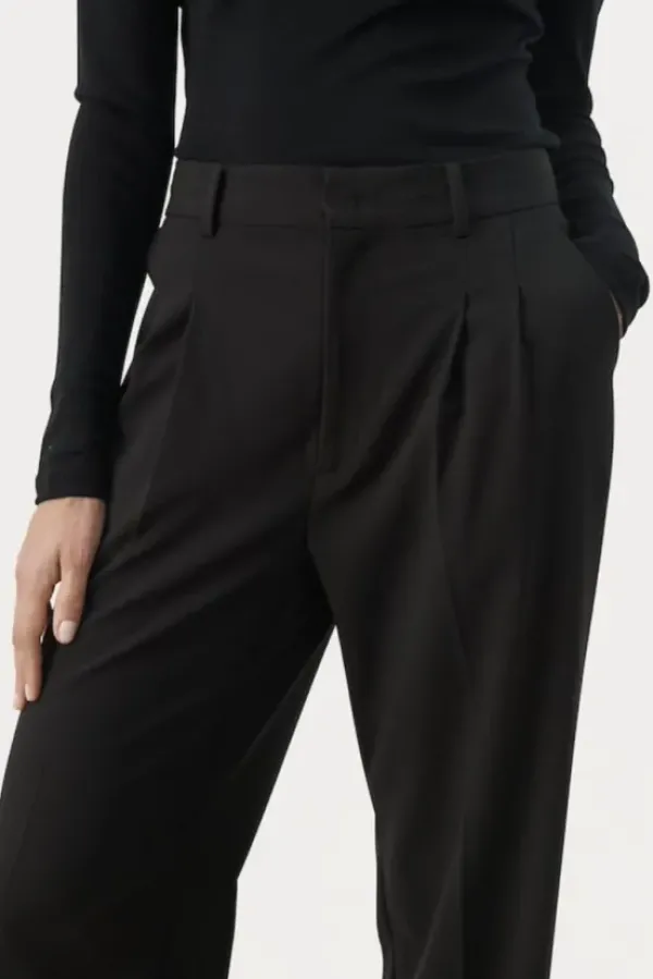 Part Twon siistit, rennot suorat housut toimistolle ja kaupungille. Klassinen malli suorilla lahkeilla. Vyölenkit ja taskut sivusaumoissa. Täyspitkät lahkeet ja kesikorkea vyötärö.