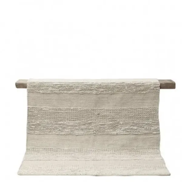 Tell Me Moren hamppumatto. Yksivärinen vaalea hiekka, ja raidat tehty kauniita kudontoja käyttäen. Kaksi kokoa 140x200cm ja 170x240cm.