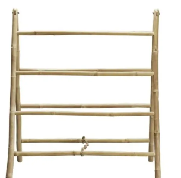 Tine K Homen bambuinen pyyheteline sopii esim. kylpyhuoneeseen pyyhkeiden kuivatukseen. Kevyt, vapaasti seisova teline on helppo nostaa myös ulos terassille. Siihen on helppo taitella vilttejä. Voit kiinnittää siihen S-koukuilla myös kasveja.