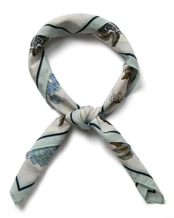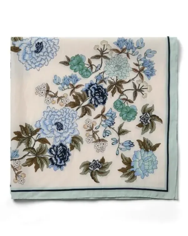 Mos Moshin kaunis, keväinen huivi ihanalla kukkakuosilla. Raikas sinisen sävy luonnonvalkoisella pohjalla.