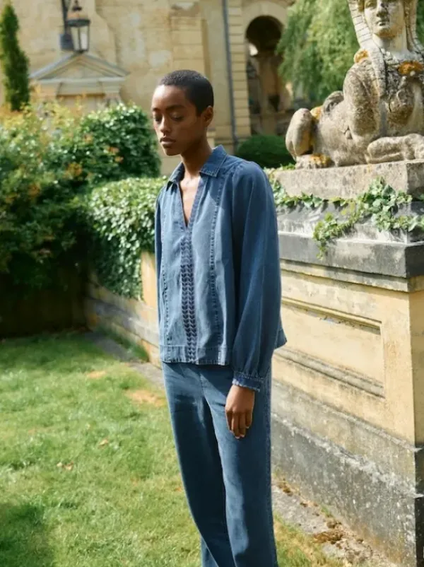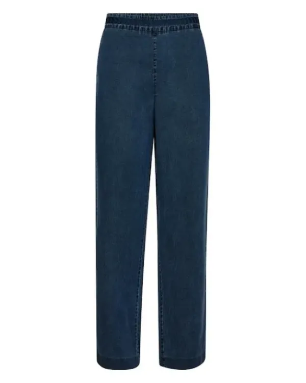 Mos Moshin mukavat housut, joissa vyötäröllä kuminauha. Vyötäröllä kivat koristeaplikoinnit tuomassa ilmettä. Kankaana denimin oloinen tencel, joka laskeutuu mukavasti. Yhdistä saman sarjan yläosaan tai pue rennosti teepparin ja neuleen kanssa.