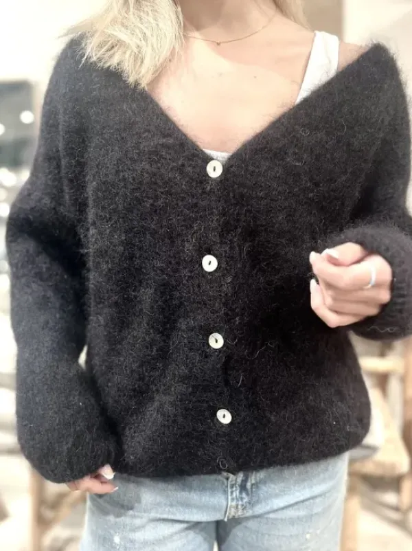 Americandreamsin Cornelia neuletakki sopii loistavasti sekä mekon että housujen kanssa. V-kaula-aukko ja napitus edessä. Tämä klassinen neuletakki on kapselivaatekaapin perusvaate.