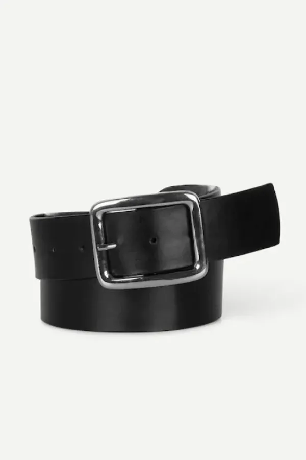 Samsoe&Samsoen musta nahkavyö näyttävällä metallisoljella. Valmistettu vastuullisesta lehmännahkasta.