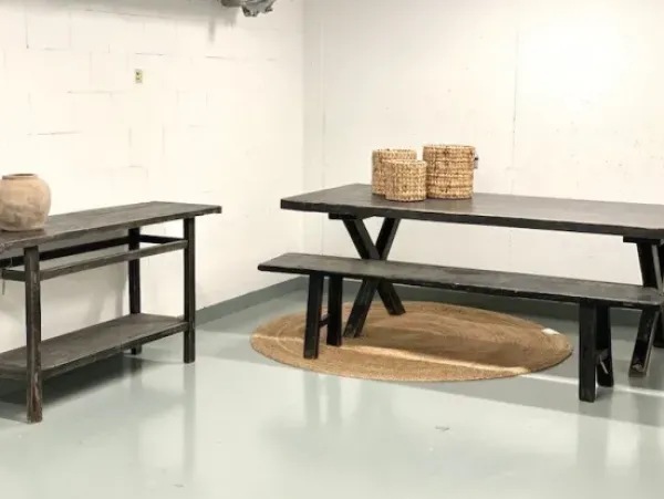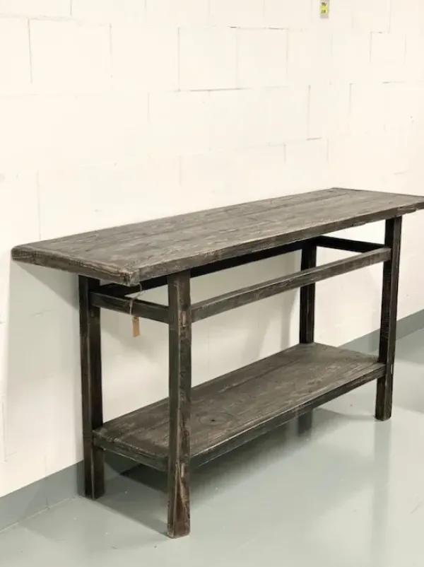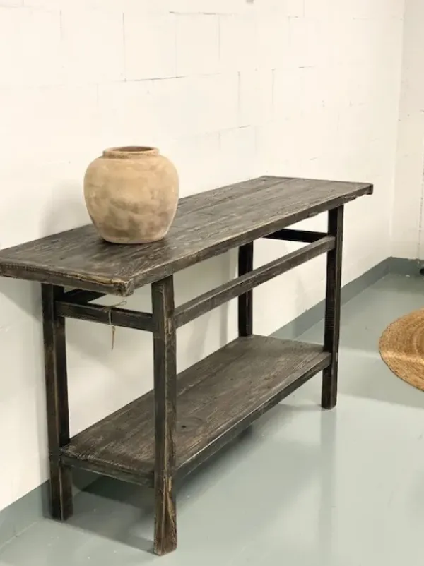 Kaunis kuluneen mustan sävyinen pitkä sivupöytä eläväisellä pinnalla. Tässä sivupöydässä on hylly, jonne voit laittaa esim. koreja, kirjoja tms. Eteiseen, keittiöön tai makuuhuoneeseen aina tarpeen ja fiiliksen mukaan. Rosoisista puuhuonekaluistamme syntyy luonnollinen ilme kotiisi!!