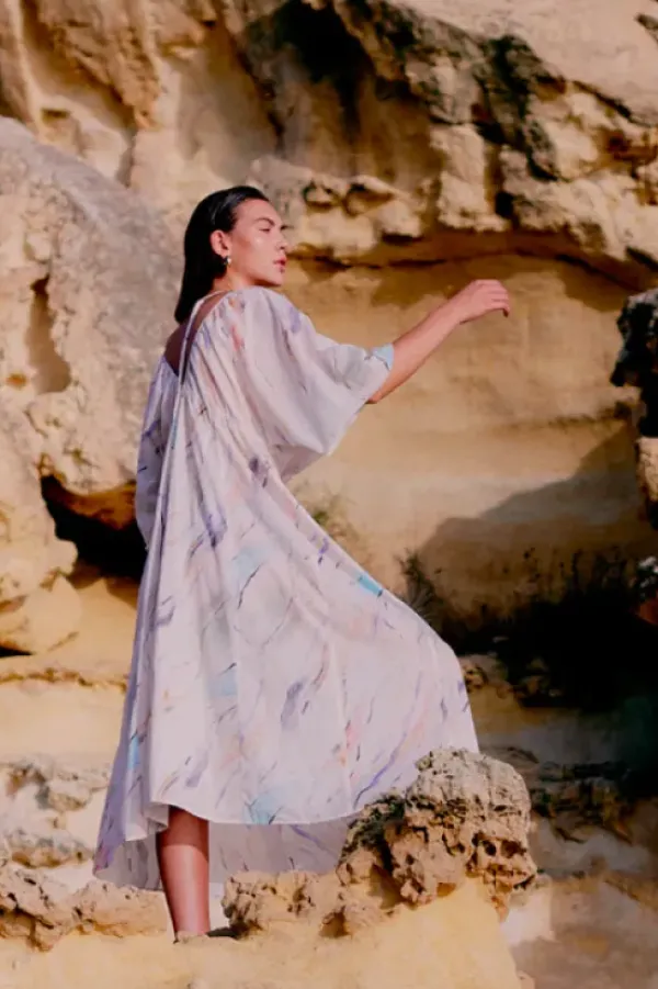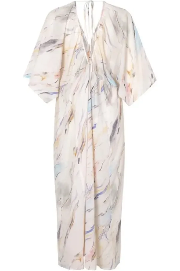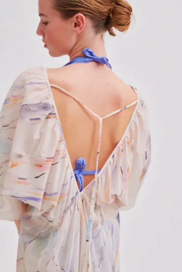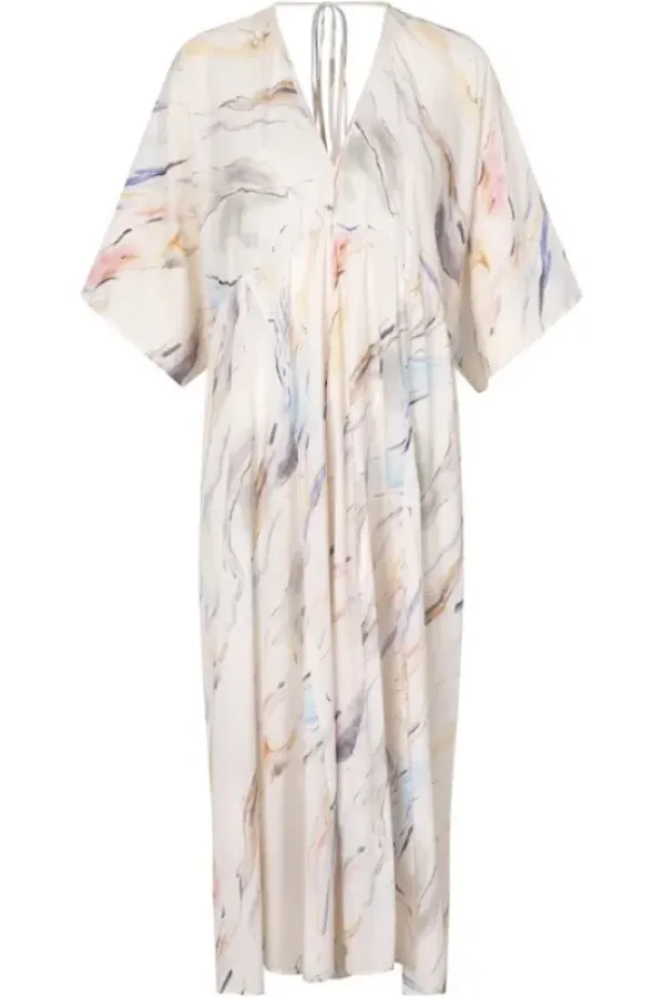 Second Femalen superkaunis pidempi mekko kesään. Mekossa v-kaula-aukko ja niskassa solmimisnaru. Herkkä kuvionti muistuttaa kaunista taideteosta.