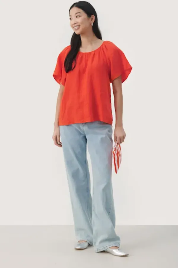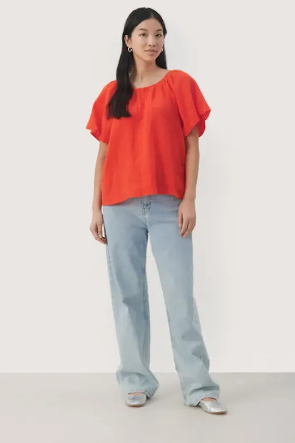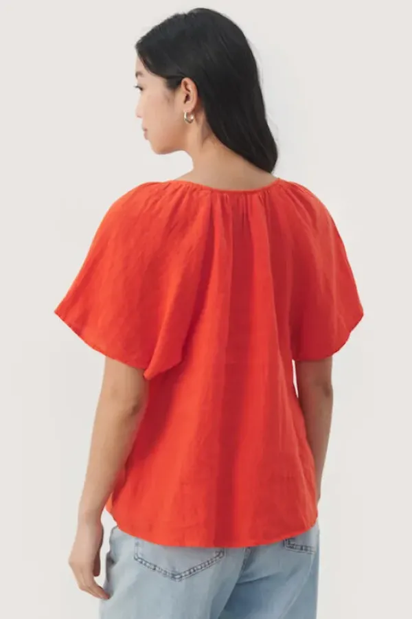 Part Twon kaunis pellavapaita kesään. Rento malli, jossa lyhyet hihat ja edessä kauluksessa nappi. Tämä on helppo yhdistää farkkujen, shortsien tai kesäisen hameen kanssa.
