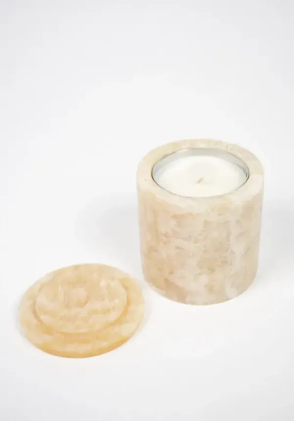 Cashmeren tuoksuinen kaunis tuoksukynttilä beigessä marmorikupissa. Kynttilän paloaika n. 45 tuntia.