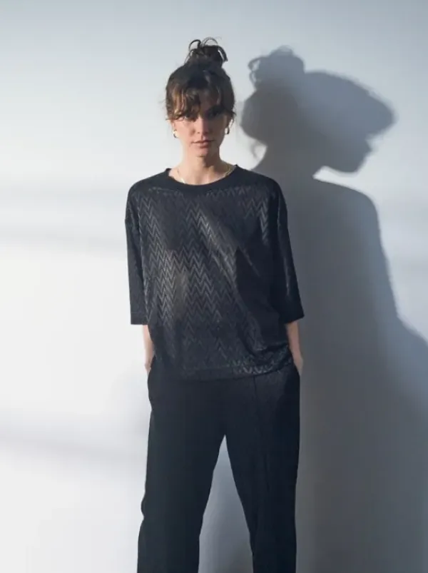 Mos Moshin kiva pusero zikzak-kuvioinnilla. Suora, rento malli. Kevyesti läpikuultava.