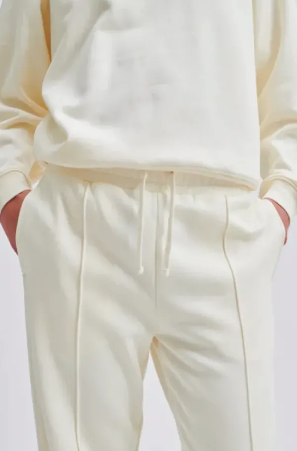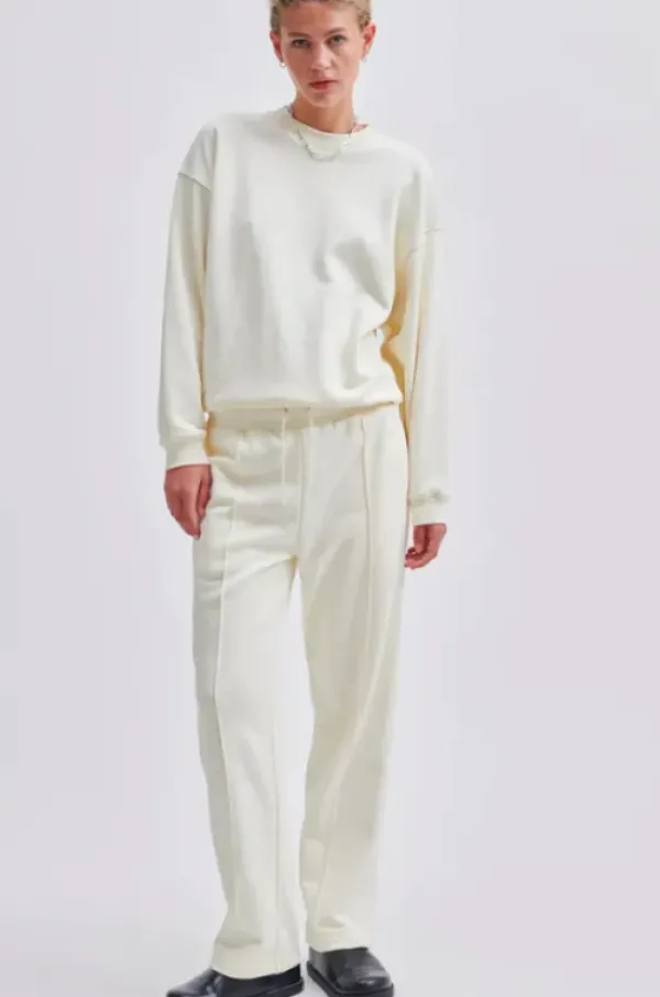 Second Femalen rennot collegehousut suorilla lahkeilla. Vyötäröllä kuminauha ja kiristysnyöri. Edessä ommellut koristeprässit. Sivusaumoissa taskut, takana koristetaskut.