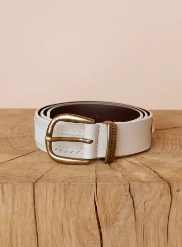 Kaunis luonnonvalkoinen vyö pintanahkaa. Vyössä mokkaisia koristeita. Yhdistä farkkujen kanssa kaunis kokonaisuus! Kaksi pituutta.