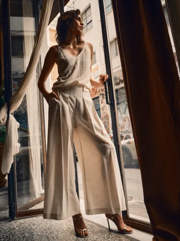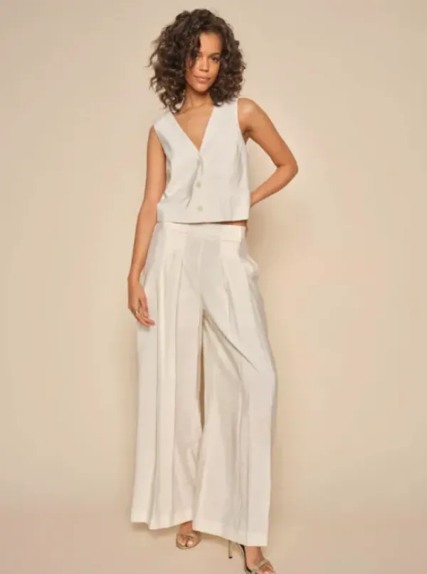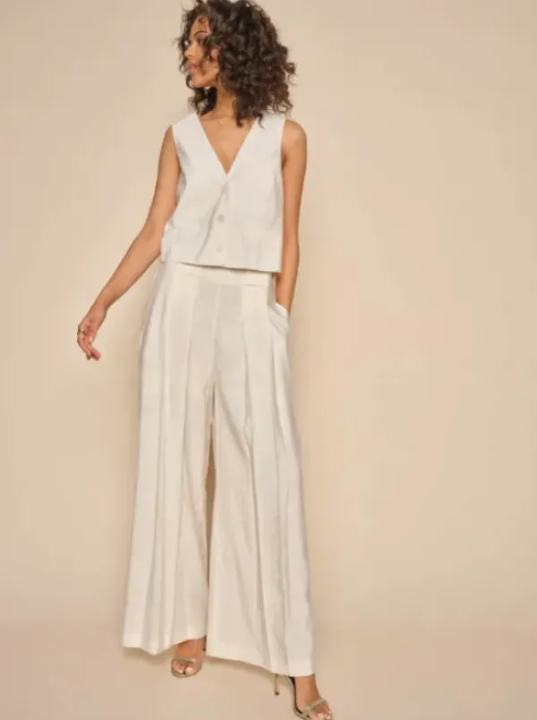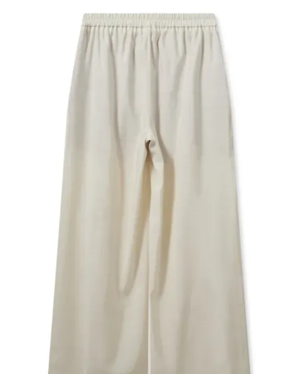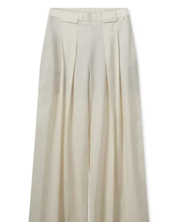 Leveälahkeiset Thea Edena housut kevään ja kesän juhliin! Voit myös yhdistää arkisempiin menoihin tennareiden tai vaikkapa loafereiden kanssa. Takana vyötäröllä kuminauha. Edessä kauniit laskospmpeleet. Sävynä luonnonvalkoinen ecru.