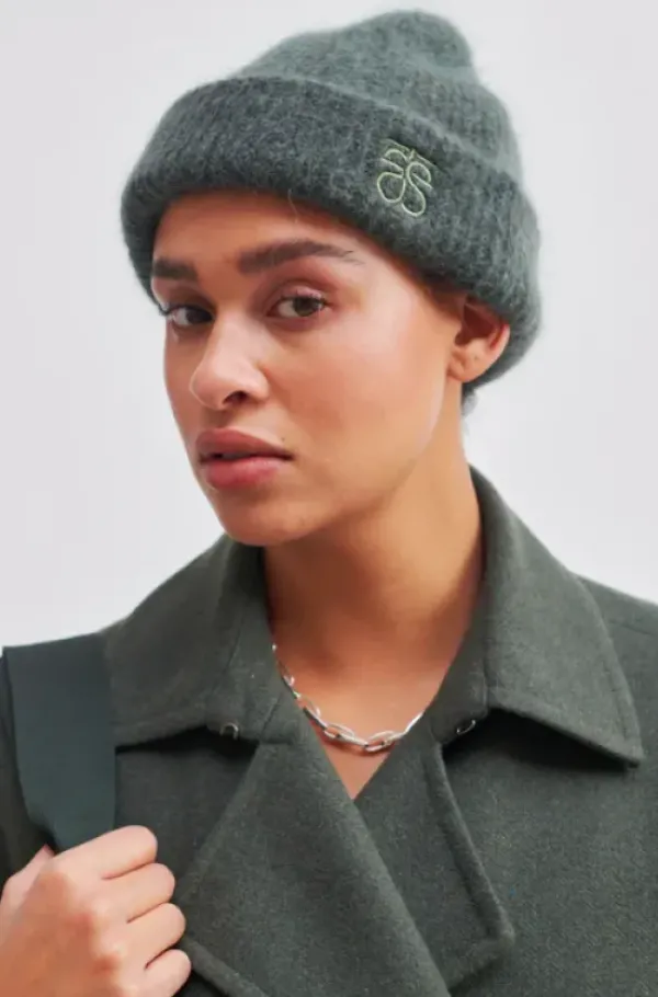 Second Femalen ihanan pehmeä beanie pipo mohairin ja villan sekoitetta. Kiva matala malli, jonka korkeutta voit säädellä taitoksella! One size. Kiva vihreän sävy.