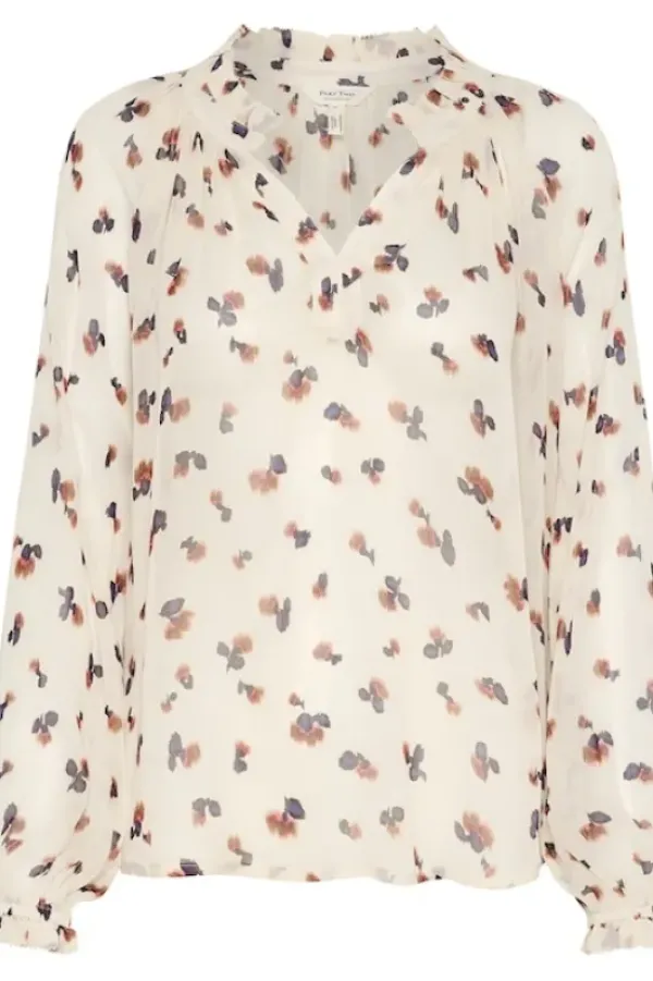 Part Twon kiva kuviollinen paita, jossa pitkät hihat kuminauhoilla. Kiva pieni pystykaulus ja edessä v-kaula-aukko. Kaunis kuviointi vaalealla pohjalla. Materiaalina laskeutuva viskoosi.