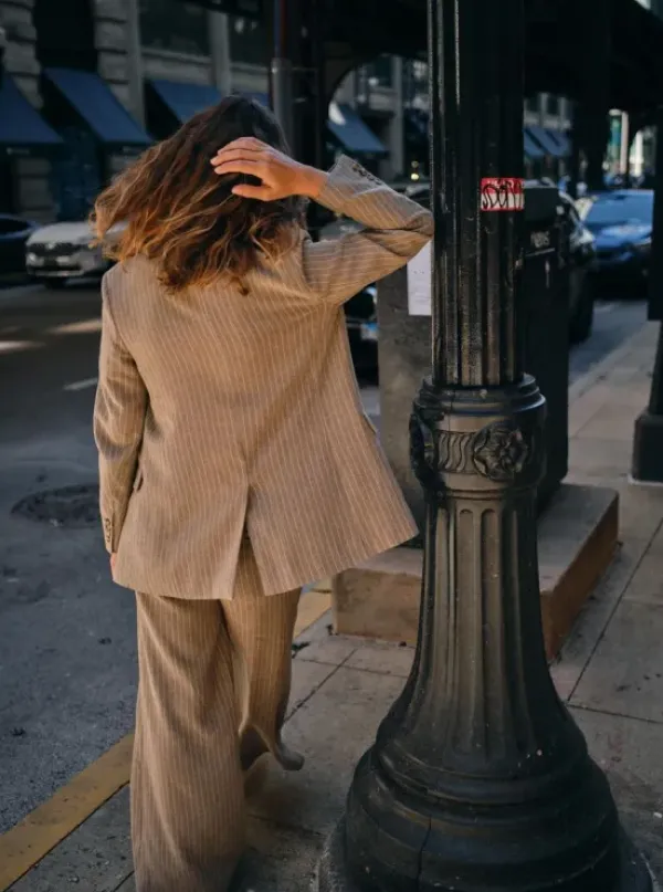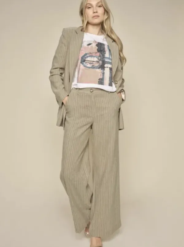 Tässä rennossa bleiserissä on ripaus villaa, mikä tekee siitä mukavan pehmeän materiaalin syksyyn. Pidempi malli, jossa kahden rivin napitus ja nappikoristeet hihansuissa. Takana halkio.
