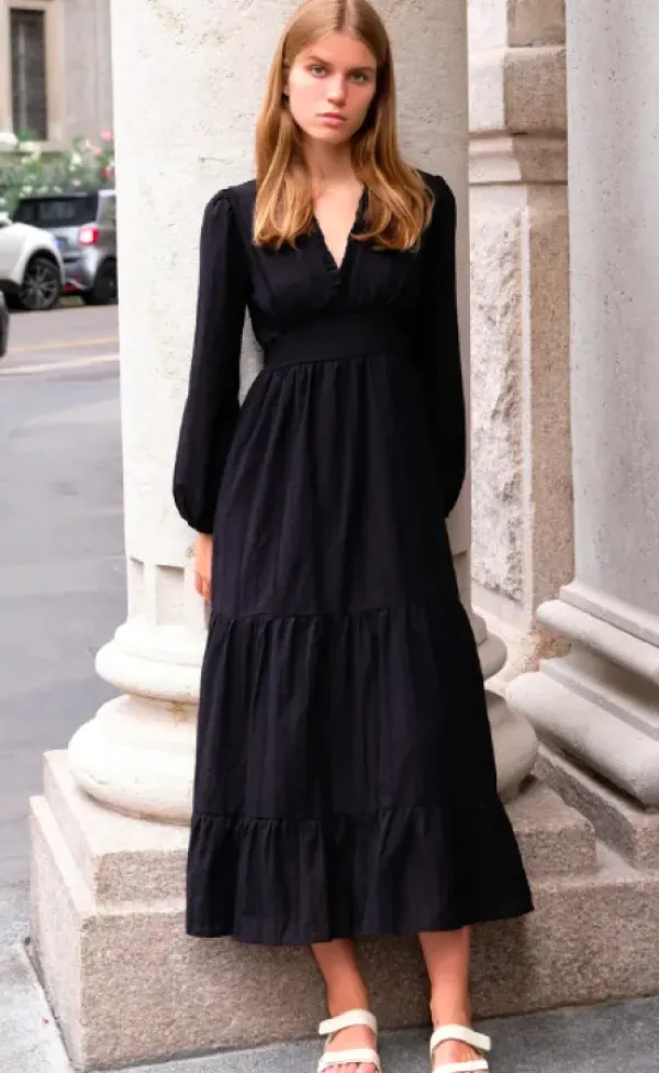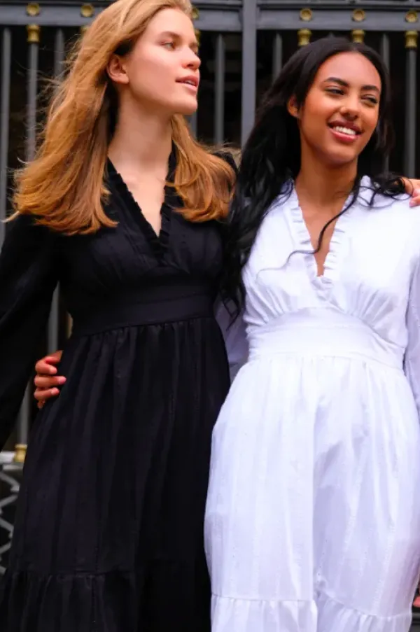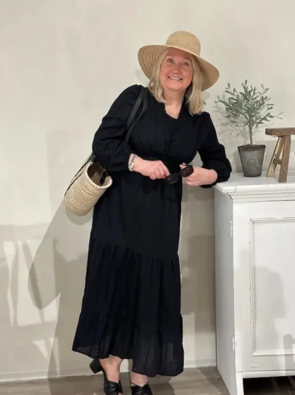 Naisellisessa Umi-maximekossa on v-kaula-aukko. Voit halutessasi pukea topin alle. Kauluksen pieni frilla ja hyvä istuvuus tekevät tästä monelle vartalolle sopivan. Vyötäröllä mukava kuminauharypytys. Pitkät hihat. Mukana alusmekko.