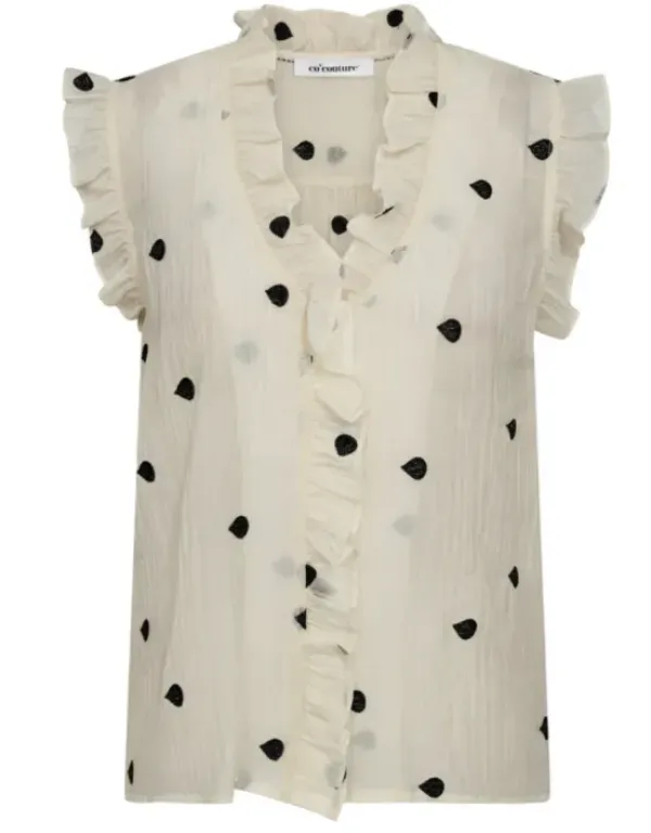 co’couturen kaunis toppi, jossa kivat frillat koristeena. Kevyt, ilmava kangas, pue alle toppi. Kivat brodeeratut tipat tuovat ilmettä tälle topille!