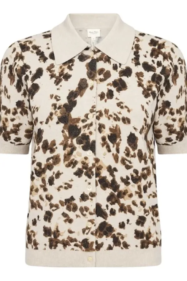 Part Twon kevään uutta: lyhythihainen neuletakki/pusero, jossa kiva leo-kuosi. Pienet paitiskaulukset.
