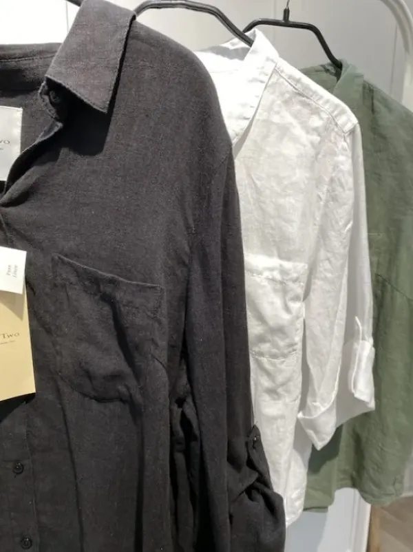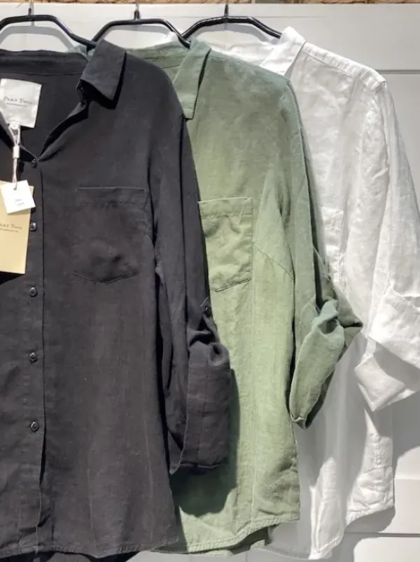 Part Twon suosittu pellavapaitis vajaamittaisilla hihoilla. Voit pitää hihat suorina tai kääriä ne ja kiinnittää tampeilla lyhyemmiksi.