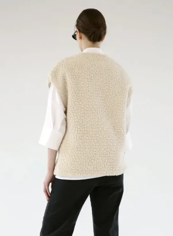 Ariana is a comfortable teddy vest with a boxy fit. It has hidden hook closure and comes in a cosy off-white colour. It’s perfect for added warmth.