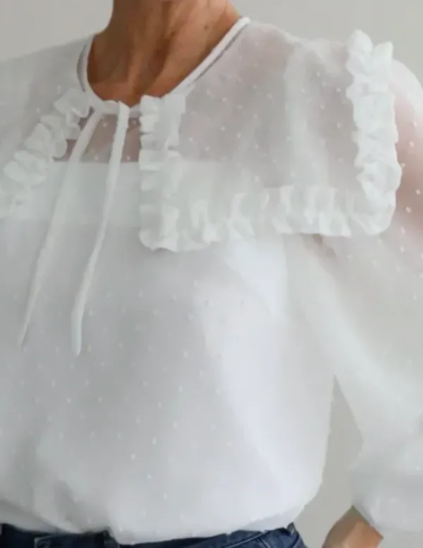 Kotimaisen Gauhar Helsingin neliönmuotoinen kaulus, jossa röyhelöyksityiskohdat, leikkisät pilkut ja rusettikiinnitys.