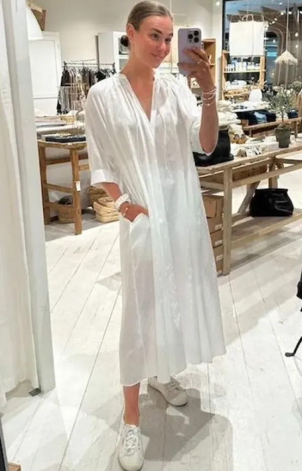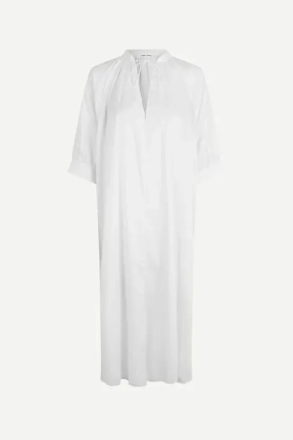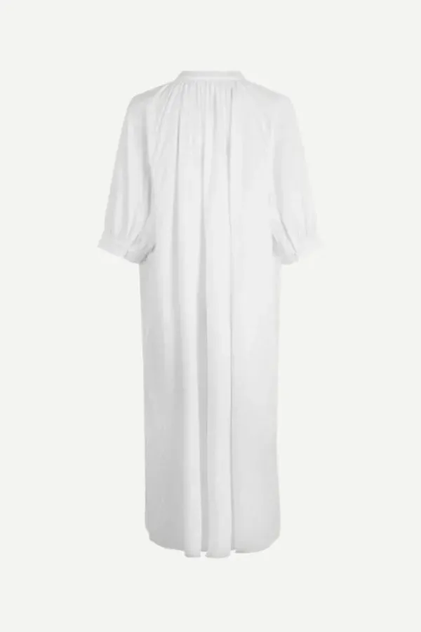 Samsoe&Samsoen kaunis puuvillamekko kesään. Tässä midi-pituisessa mekossa on yksityiskohtina kauniit puhvihihat ja rypytys kauluksessa. Kankaassa ilmettä tuomassa jacquard-kuosi palloilla. Sivusaumoissa taskut ja hihansuissa nappikiinnitys.