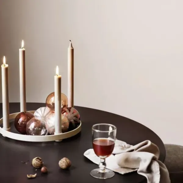 Tine K Homen kaunis rengaskynttelikkö neljälle kruunukynttilälle. Tämä metallinen kynttelikkö on maalattu hiekan sävyiseksi.