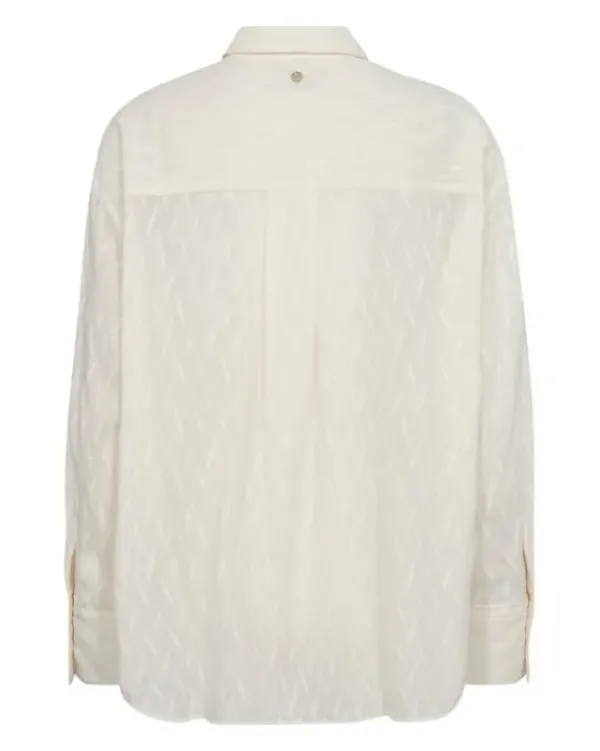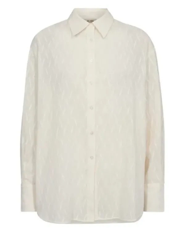 Mos Moshin kaunis paitis, jossa rento, suora leikkaus. Istuvuutta lisäävä laskos selässä ja pitkät näyttävät hihatampit. Kankaassa kiva kuviointi. Sävynä lämmin valkoinen.