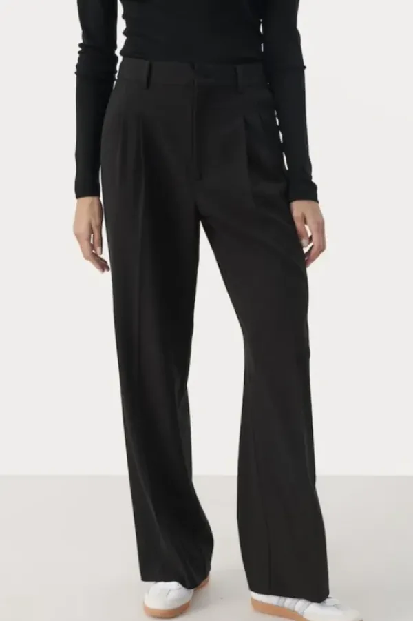 Part Twon siistit, rennot suorat housut toimistolle ja kaupungille. Klassinen malli suorilla lahkeilla. Vyölenkit ja taskut sivusaumoissa. Täyspitkät lahkeet ja kesikorkea vyötärö.