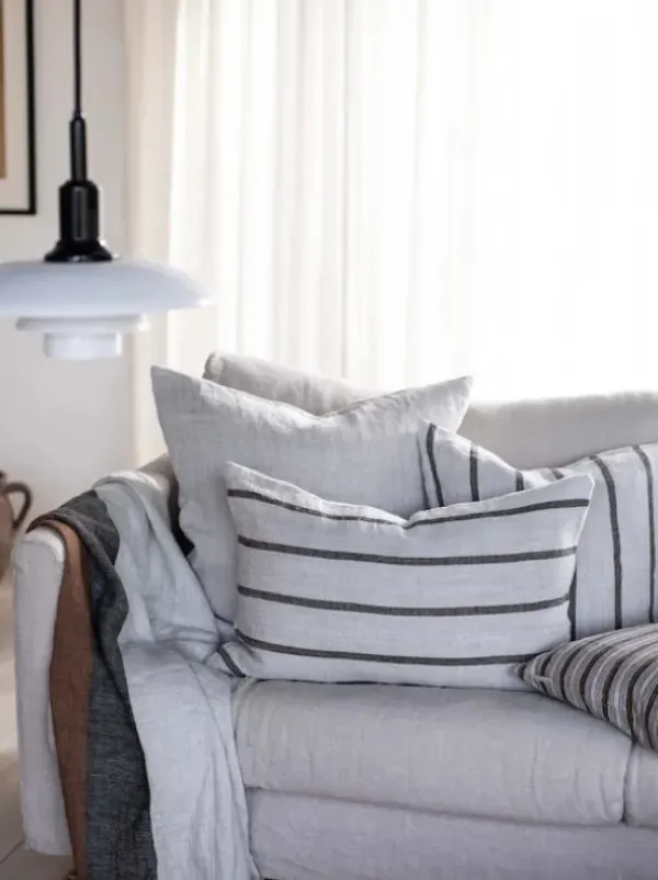 xxTell Me Moren kaunis tyynynpäällinen ihanan rosoista pellavaa. Kaunis raitakuosi on helppo yhdistää yksiväristen tyynyjen kanssa. Vetoketjukiinnitys. Eurooppalaista pellavaa.