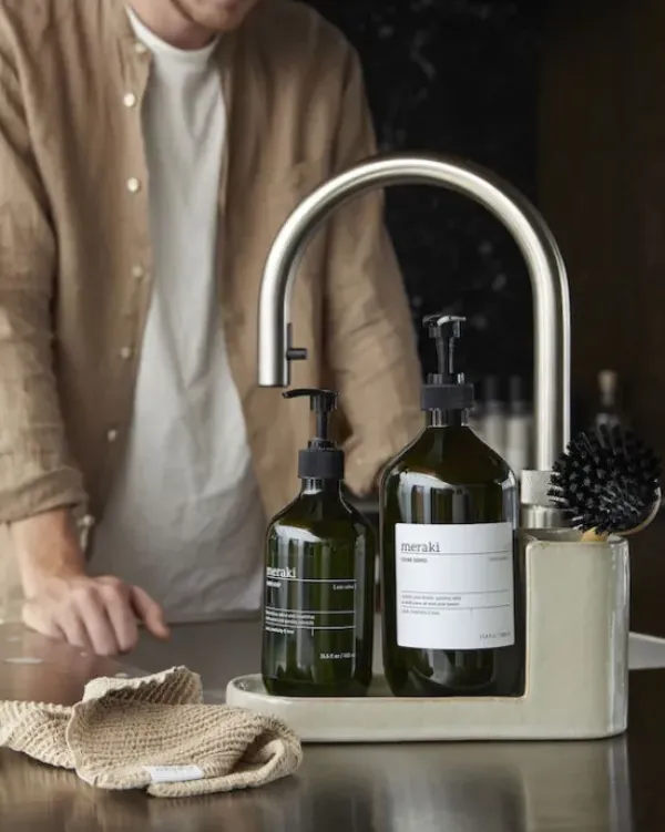Merakin kaunis harmaasävyinen keraaminen teline tiskiharjalle ja tiskiaineelle. Tähän telineeseen mahtuu kaksi pesuainepulloa.