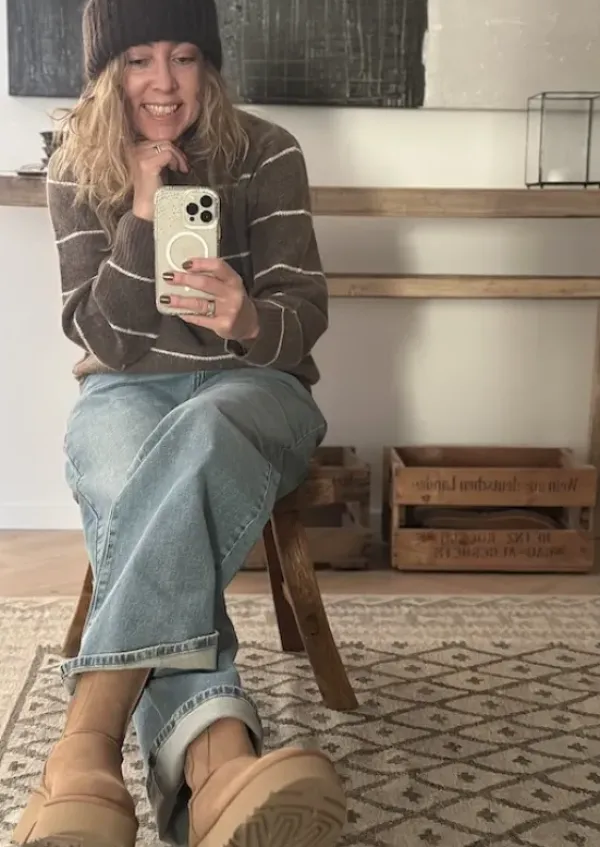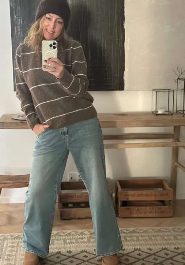 Yhdistä neuleiden, paitisten ja paksupohjaisten kenkien kanssa rento look! Voit valita normikokosi tai jos haluat rennomman ilmeen niinkuin Leealla raitaneuleen kanssa kuvassa, valitse kokoa suurempi.