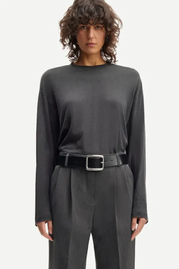 Samsoe&Samsoen musta nahkavyö näyttävällä metallisoljella. Valmistettu vastuullisesta lehmännahkasta.