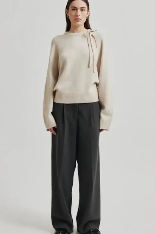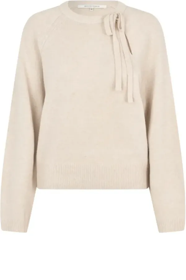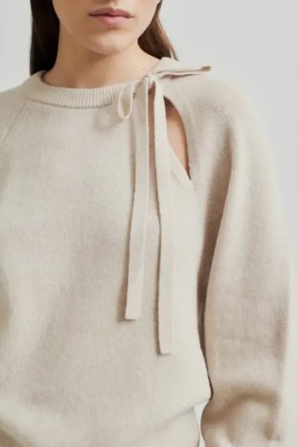 Second Femalen talven uutuus: kaunis naisellinen neule, jossa yksityiskohtana solmittava rusetti olalla. Sävynä meleerattu hiekka. Yhdistä suorien housujen tai hameen kanssa, toimii arjessa ja juhlassa.