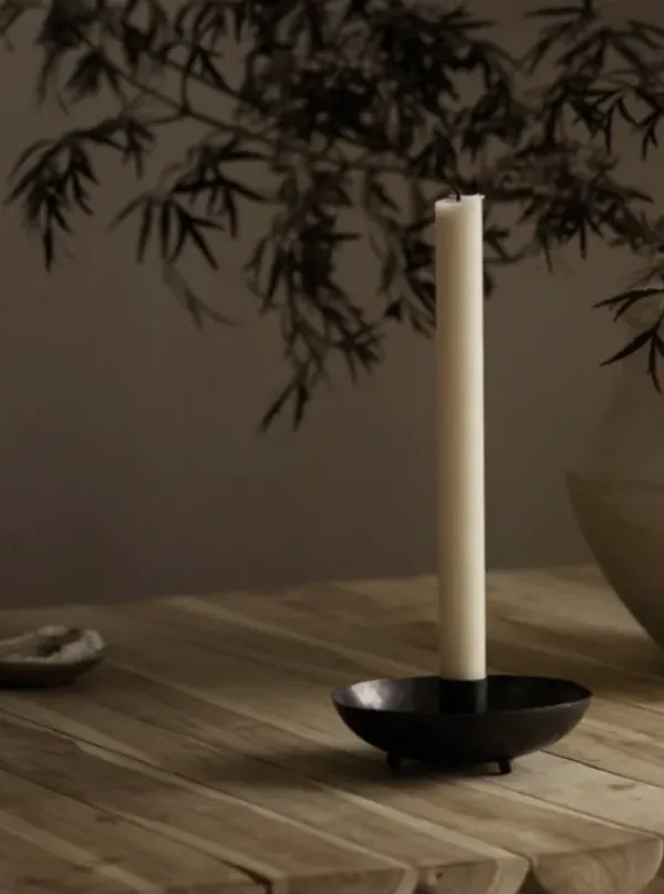 Tine K Homen kiva metallinen kynttilänjalka pienillä jaloilla. Tehty käsityönä Marokossa. Materiaalina hapetettu messinki. Sopii kruunukynttilälle.