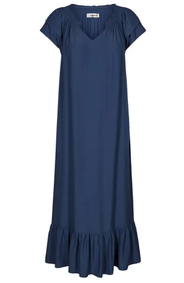 Tanskalaisen Co’Couturen kaunis midipituinen viskoosimekko, jossa lyhyet hihat ja kevyt frilla helmassa. Pituus puolisääreen. Ihanan rento malli, jonka voit asusteilla muuntaa arkisemmasta juhlavammaksi.